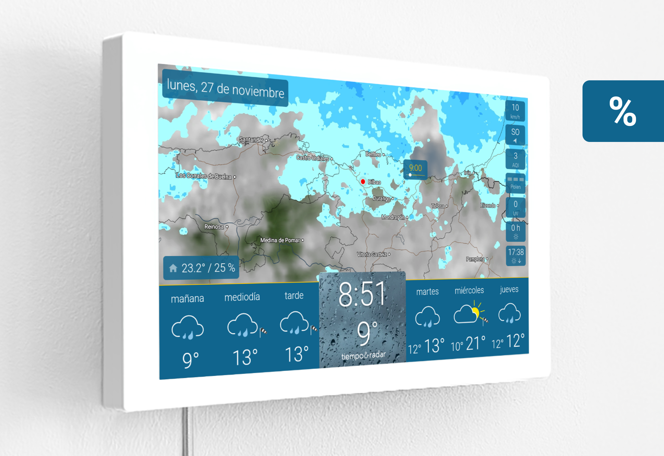 - El tiempo siempre a la vista - gracias al soporte de pared especialmente diseñado y a medida